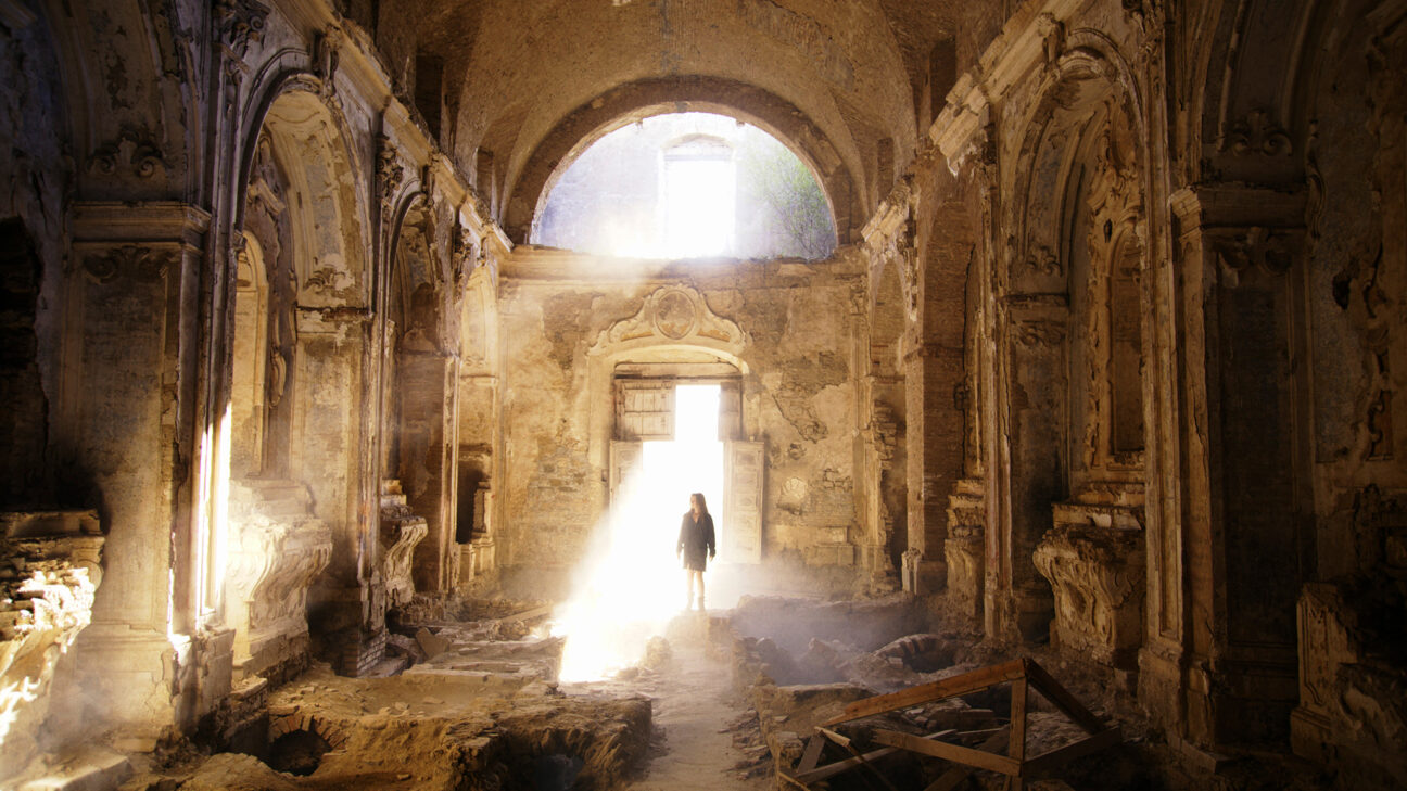 A naked woman awakes on a deserted beach. After wandering around, she ends up in the ruins of an abandoned town. The living left long ago. In a tumbledown house she finds artefacts of existence: clothing, furniture, a record player and a telephone. The latter contains a young couple’s photos and videos. Arianna and Leonardo loved taking selfies and meticulously recorded their holidays and excursions, but also their intimate moments at home.