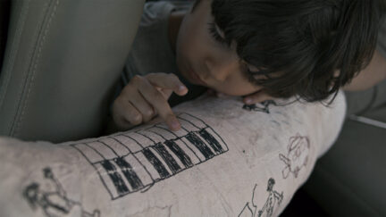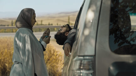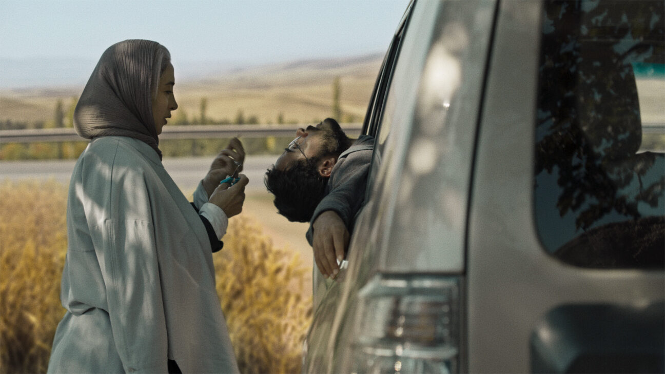 Seatbelt… Mirrors… Handbrake… Clutch… Father, leg in plaster on the back seat, growls driving instructions. His hyperenergetic young son dances and jumps around the car. They bicker about the ill dog in the trunk, but from the passenger seat mother mainly tries to keep things light. The eldest son drives this unruly group – to which he doesn’t seem to entirely belong – in silence, through broad Iranian landscapes.