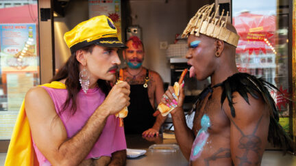 Thoughts like this certainly can cruise through one’s mind when faced with the kinkily delicious, occasionally animated part-musical Captain Faggotron Saves the Universe, which is shamelessly classic in its camp attitude. The story of a closeted priest who finds himself in the midst of a battle for the world’s sexuality could have been told exactly like this half a century ago – and then as now, it’s good to see the Christ giving the poor shepherd His blessings while getting stoned and bitching about His biographers who simply never loved Him the right way. Also, the exquisitely garish costumes cut from becomingly cheap cloth, the minimalist set design that sometimes simply consists of a friend’s living room and at other times outrageously tacky stuff tagged to a wall, remind connoisseurs of deviant movie pleasures of just about everybody from Jack Smith to Wakefield Poole to Rosa von Praunheim. Be in the vanguard! Join the ranks of Captain Faggotron!
