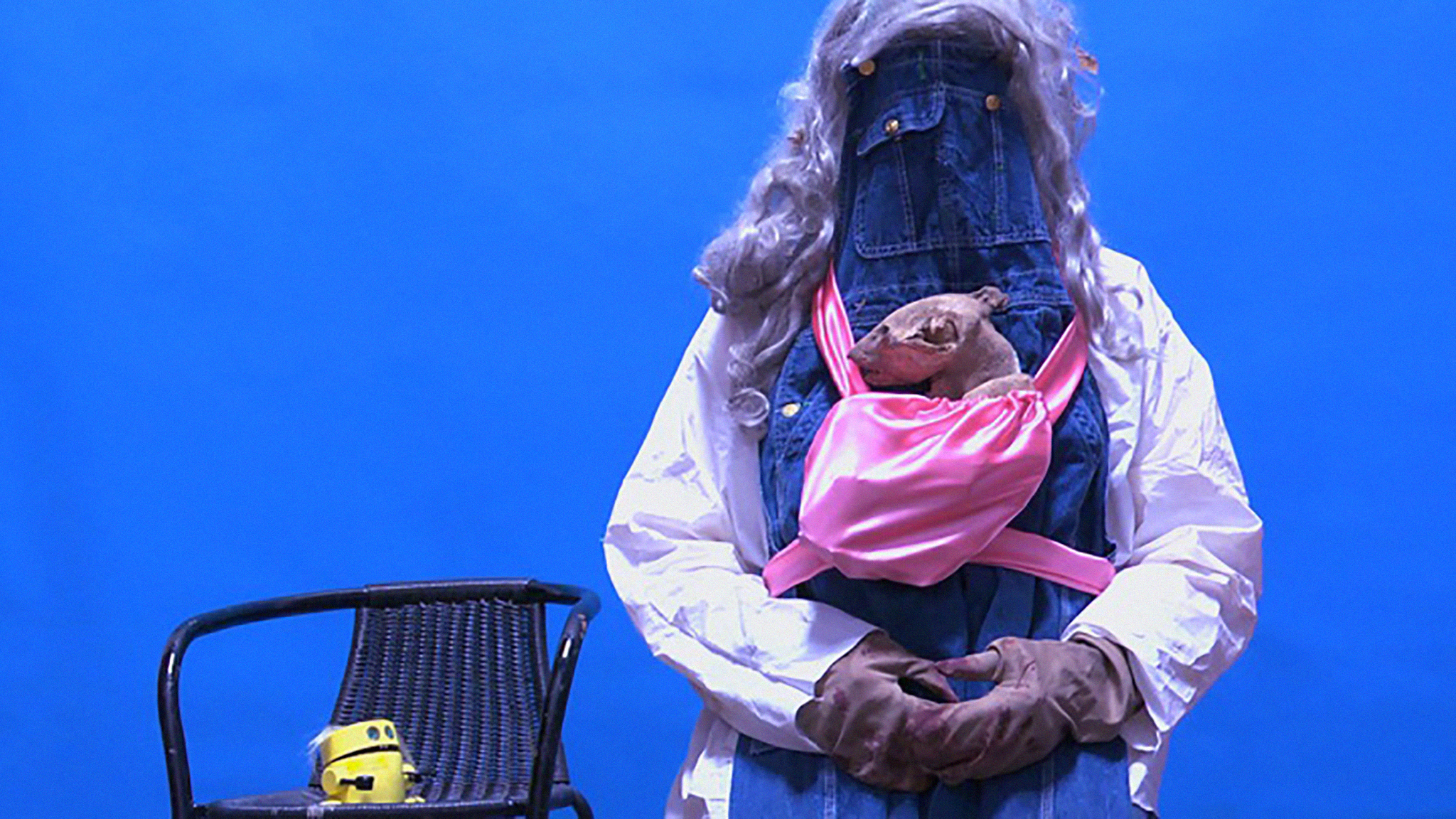 Ominous moving objects create tension while a ‘happy’ song plays. Stanya Kahn’s morbid, humorous collaboration with painter Llyn Foulkes, whose unique three-dimensional approach serves as an inspiration, features the artist blindfolded, covered with blood and dust, and an original song written and performed by Foulkes.