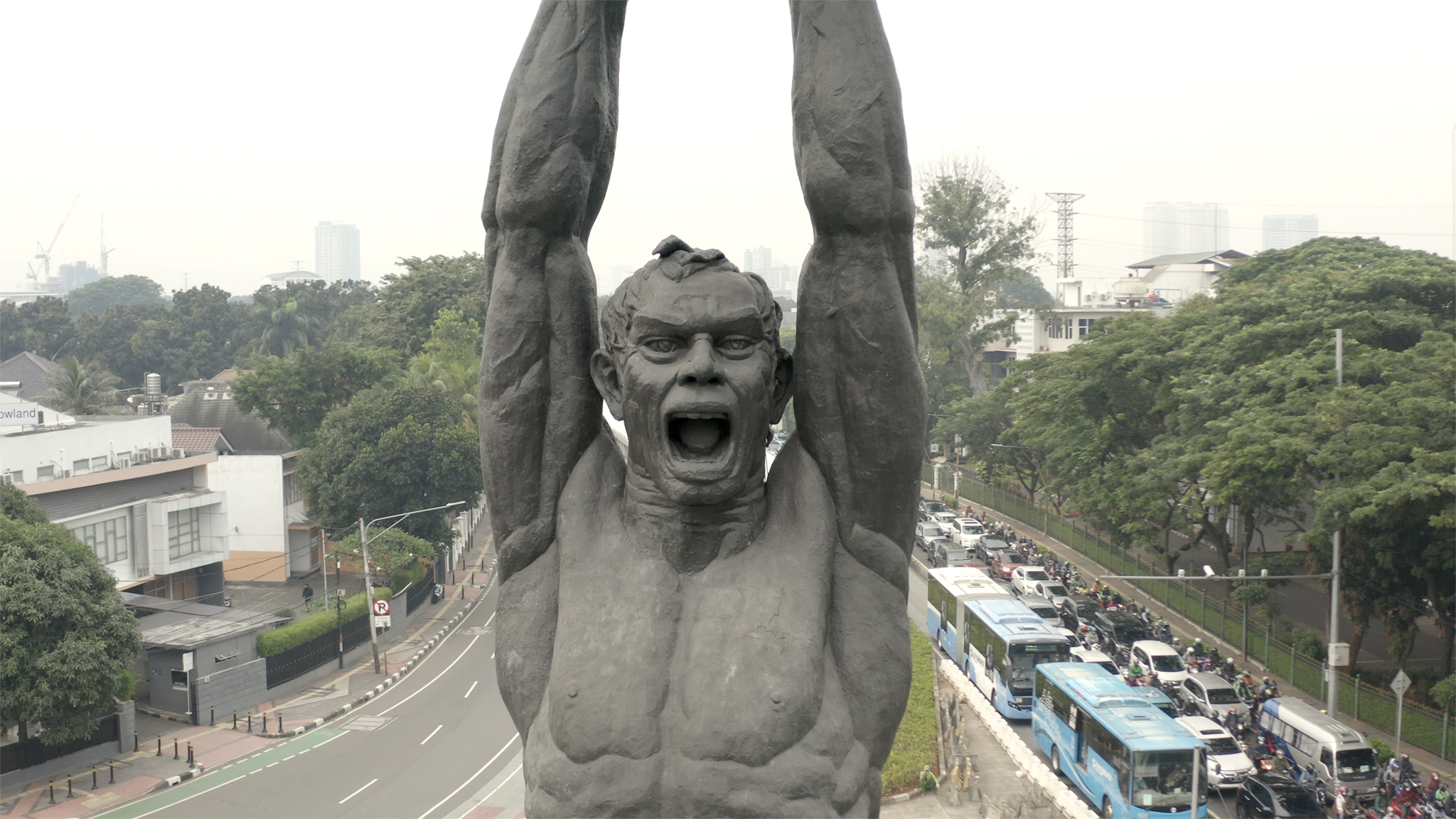 Five members of the Indonesian art collective ruangrupa (which directed this year’s controversial Documenta exhibition) each walk to a spot where a monument stands. Once glorious, these figures are now a little hidden, forgotten, unseen. Each one, from Pizza Man to the Welcome Monument, embodies a transformative moment in the nation’s political history, an index of its hopes and dreams. The artists stage conversations with these objects, within a repeated format suited to gallery installation as much as to film projection.