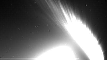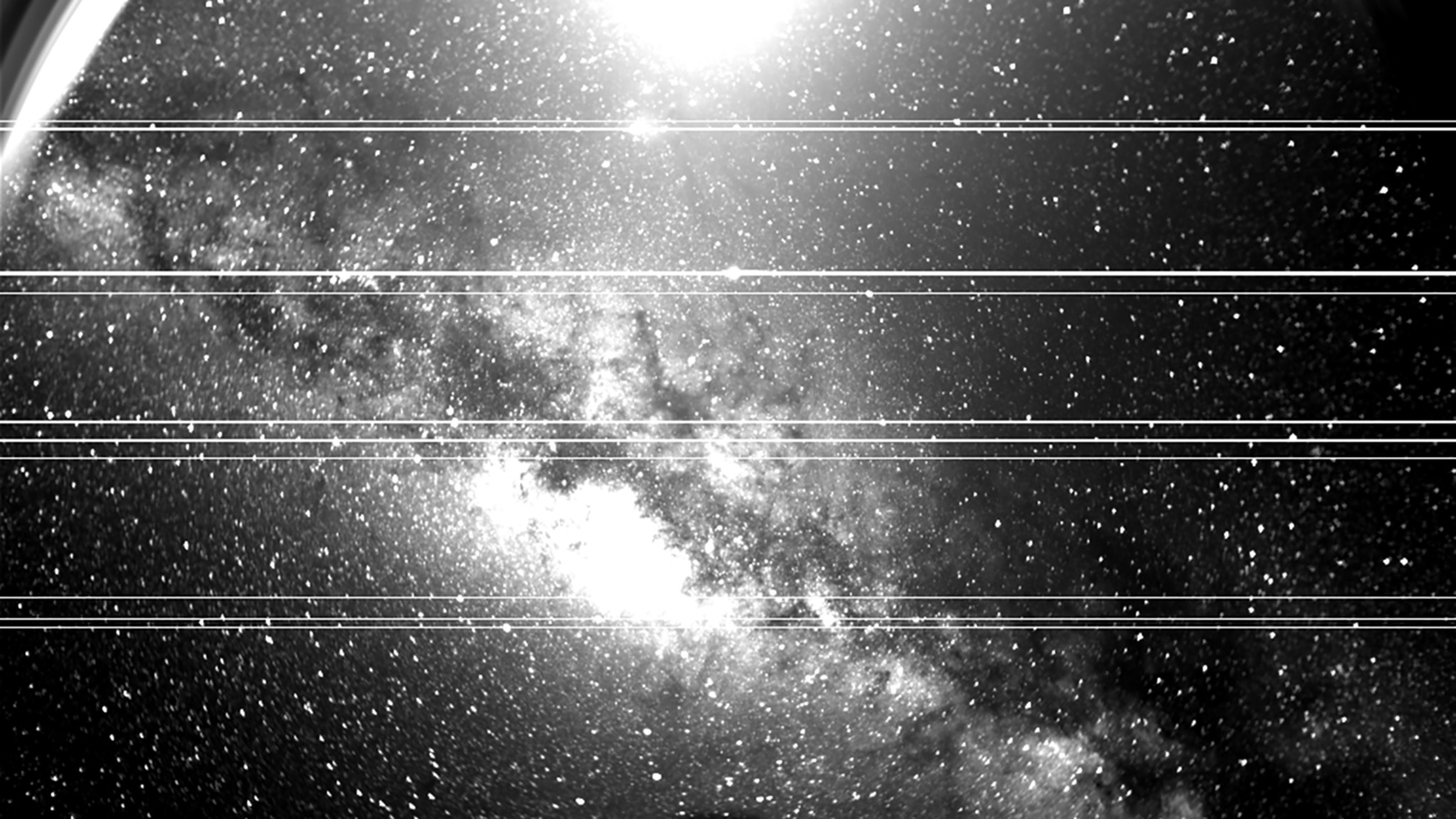 Black Rain, by British artist duo Semiconductor, is based on images from the NASA’s STEREO mission (2006–2008), satellites launched to observe a host of solar and interplanetary phenomena. Spectacular light patterns intersect with flares, bands and video glitches, reminding us of a mediating perspective. Refusing contextual information or spatial and temporal scales, the film casts us adrift in the cosmos, compelling us to share its awe at the mysteries of the universe.