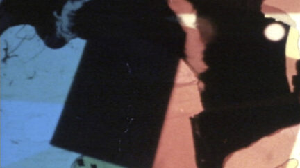 Frame by frame, we see abstract, hand-painted images tussle with scraps of photographic representation. Which will win? Woloshen crafts a cascade of visuals in the manner of Stan Brakhage: scratches on the celluloid, sprocket holes, fleeting geometric shapes are glimpsed for a split-second before being snatched away. Intermingled are flashes of heavily erased faces and places, occasionally bursting through into visibility. Cinema is the sum of this endless struggle.