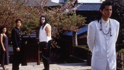 From this Shakespearean premise flow forth buckets of blood as Riki and the kids commence an assassination campaign against the top figures of the local underworld, with the patriarch as the ultimate target. Like a manga sprung to life, this day-glo coloured gangland parody is all gleefully executed excess, directed by a young and eager Miike Takashi at his most outrageous. Fudoh ended up in TIME Magazine’s top 10 films of the year, resulting in Miike being invited to join Francis Ford Coppola and Wayne Wang’s sadly aborted Chrome Dragon project.