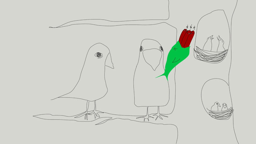 Two exasperated birds sit on a branch and contemplate their experiences. Their everyday labours are not far removed from ours. -