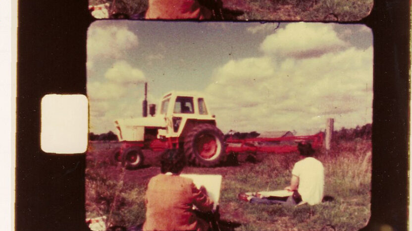 A small landscape painting with the still young film maker and his mother, calmly sketching on the edge of an agricultural area. -