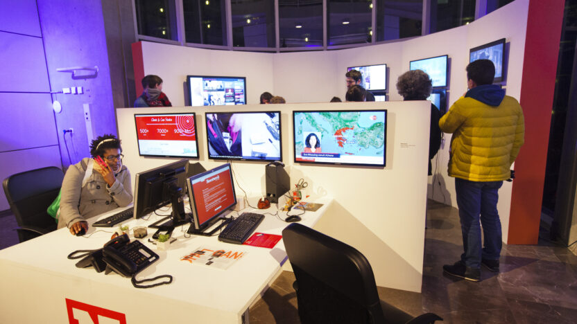 The audience is invited to change the news and disseminate its own propaganda. This interactive installation raises questions on the democratisation o -