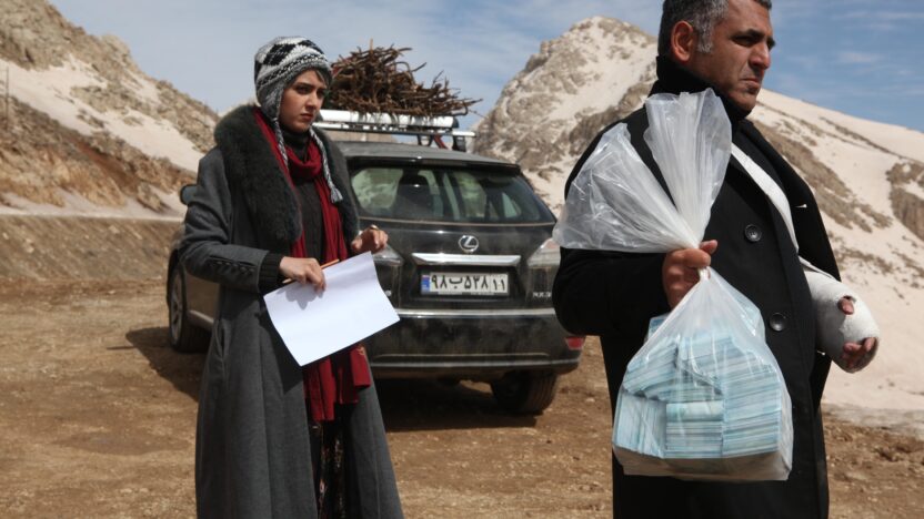 An urban man and woman, a large car with a trunk stuffed with big bags of money: they are an unusual apparition in the grim… -