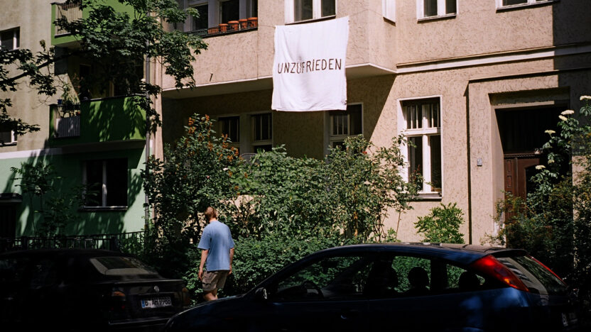 Out of the window of a Berlin apartment, a banner is hanging with the exclamation: Unzufrieden (dissatisfied). -