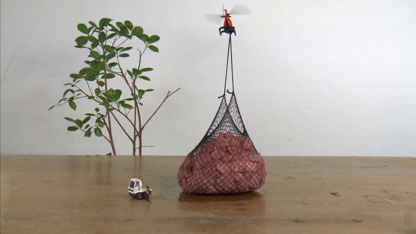 War on the kitchen table. Helicopters shred a newspaper, a drone fires on the broccoli. The absurd relationship between our daily lives and the news.