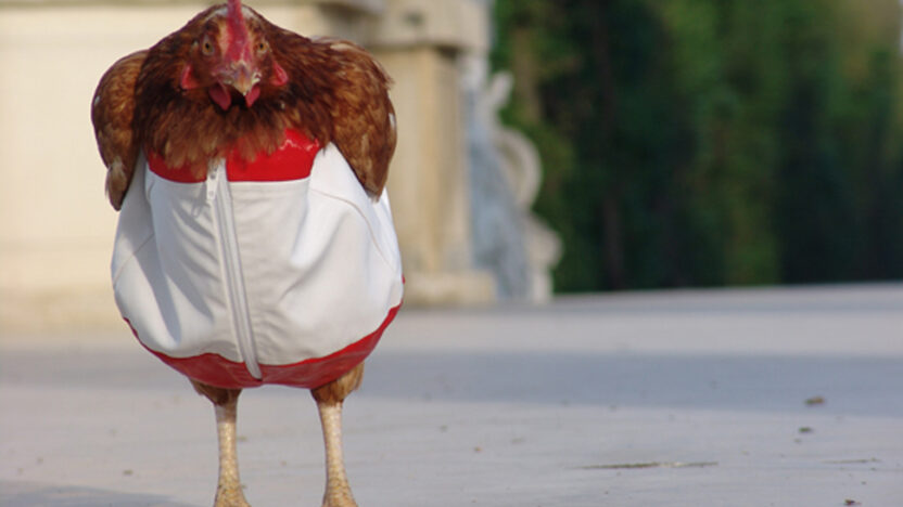 A chicken in a suit is chased through the streets of Vienna. A statement.