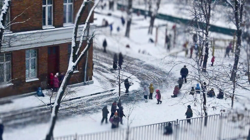 Captured and simultaneously accelerated, the fleeing moment of the first winter snowfall on a residential street in Moscow.