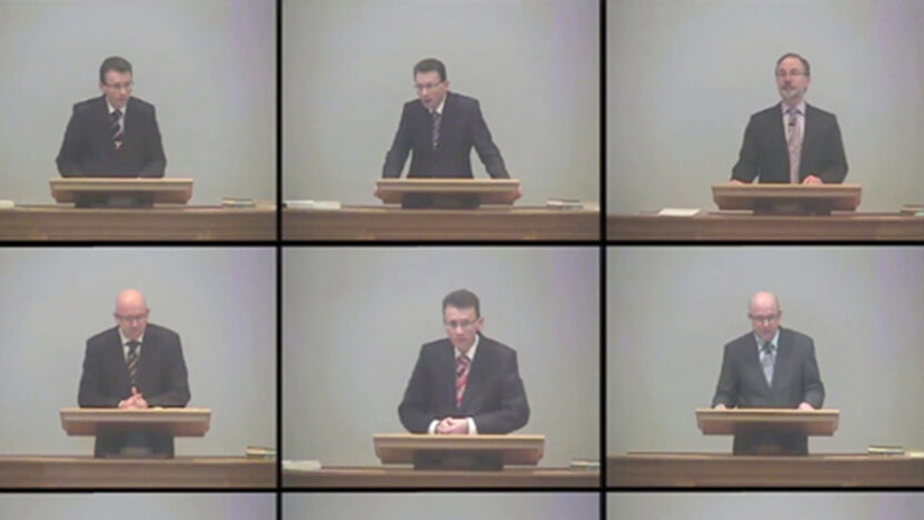 Nine simultaneous frames scrutinise the rituals of nine different Reformed Church gatherings.