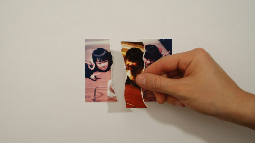 Collage of scraps of photographs of three children shot in 1989. At the end, the pieces fall into place. Intimate reflection on time’s progression.
