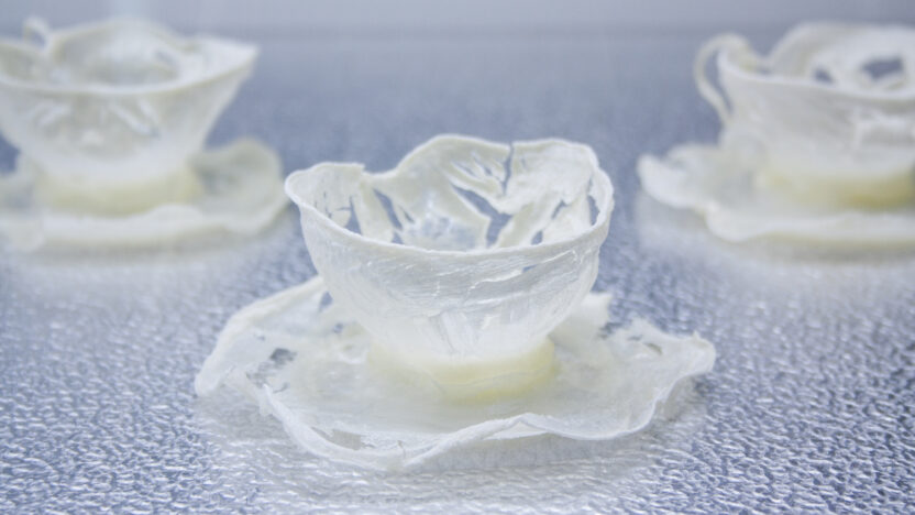 Frozen milk in the shape of a tea set is presented in a showcase, reminding us of Snow White’s glass coffin. No eternal life without…