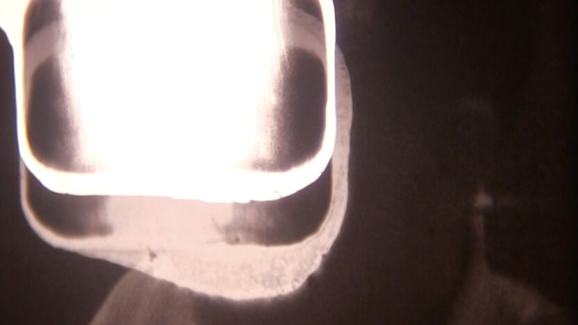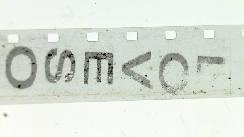 A found Super 8 cartridge of a vintage wedding intervened upon beyond recognition. -
