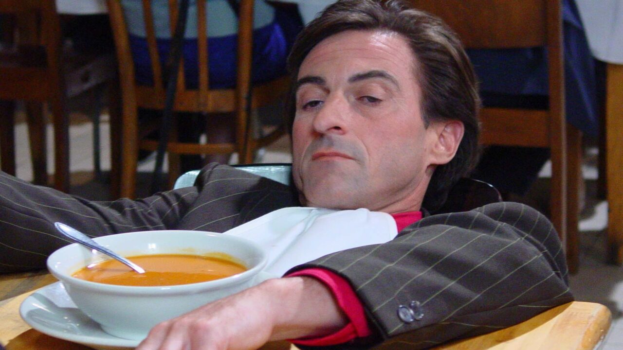 In een groot restaurant zit een man alleen te eten. Hij wordt genegeerd door het personeel en meewarig aangekeken door de mensen om hem heen. Als eindelijk zijn soep arriveert, blijkt deze flauw. Het zoutvaatje zit echter vastgeplakt aan de tafel…