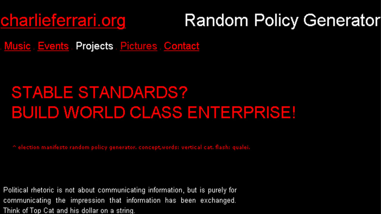 De Election Manifesto Random Policy Generator creëert statements die, zoals in de politieke retoriek, schijnbaar kloppen, maar bij nader inzien niet meer inhouden dan een vage notie van positiviteit. Met een lijst van honderd woorden en diverse zinsstructuren creëert de Policy Generator duizenden verschillende beleidslijnen. Het resultaat klinkt beangstigend vertrouwd.