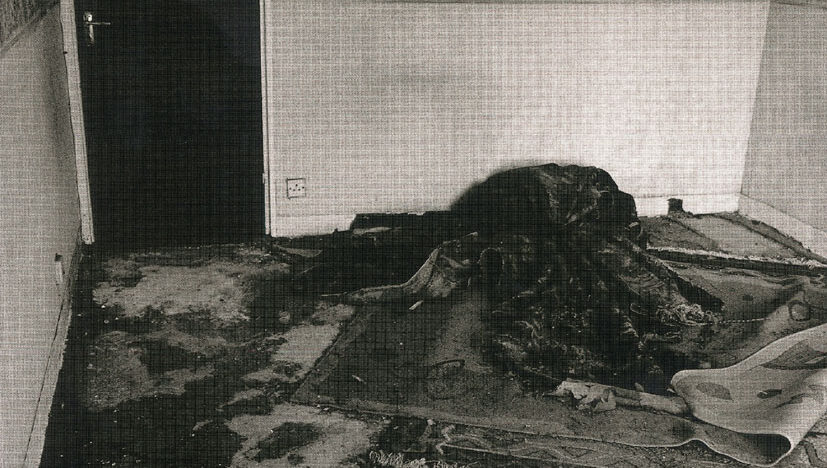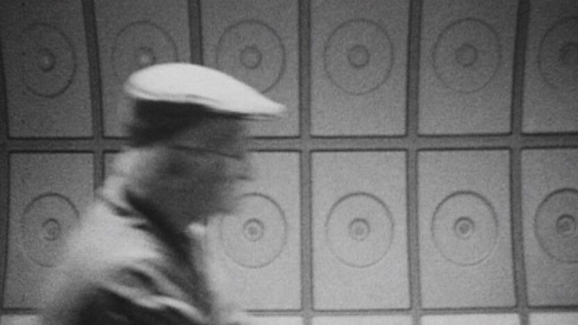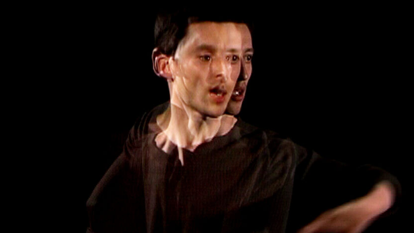 Een man loopt door een landschap. Maar zijn voeten zijn aan de grond vastgeplakt en er is geen landschap buiten zijn eigen lichaam.