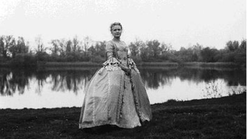 Een vrouw in een Zeventiende Eeuwse jurk staat aan de rand van het meer en kijkt uit over het water. Wanneer we haar naderen tilt…