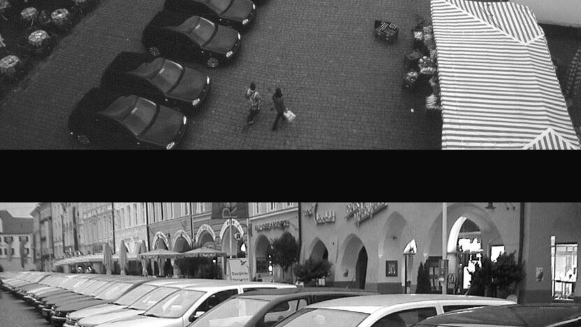 Reacties van voorbijgangers op een binaire code, gevormd door zwarte en witte geparkeerde auto’s.