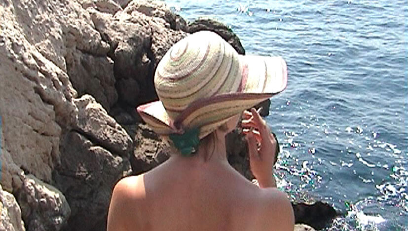 Een vrouw zit op rotsen aan het water. We zien haar op de rug, terwijl zij een sigaret rookt. Het lijkt een vakantiefoto. Onderin beeld… -