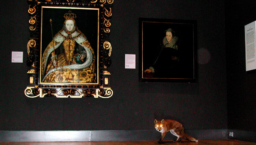 Installatie gegenereerd uit het geavanceerde CCTV-systeem (closed ciruit television) van de National Portait Gallery, met de vos Bandit ’s nachts vrij