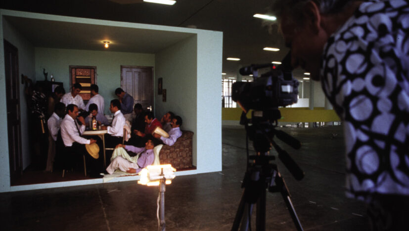 Installatie waarin een burgerlijk appartement voor onze ogen opgebouwd en afgebouwd wordt in opeenvolgende bewegingen van een ronddraaiende camera. Me -