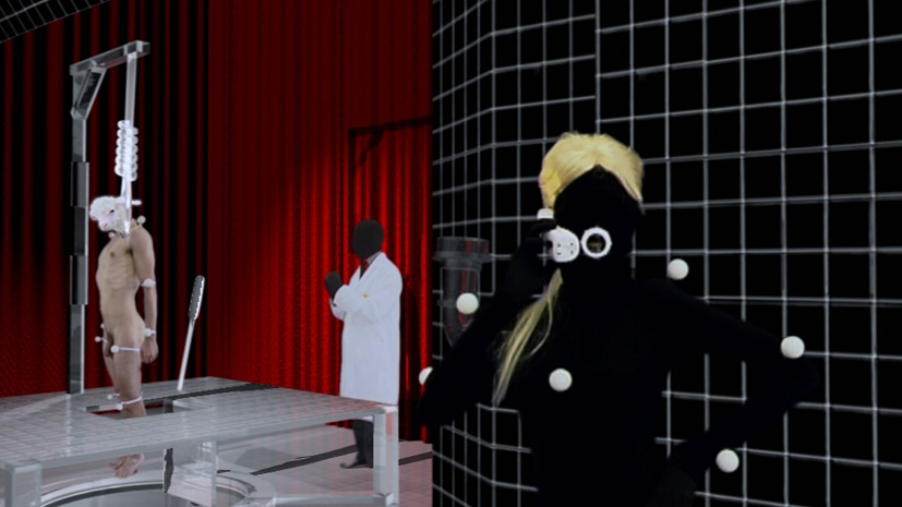 Installatie met een schuurtje te midden van een blue-screen filmset, met synchrone projectie van de video van Al+AL voor Channel 4 en de Toxic-video v -