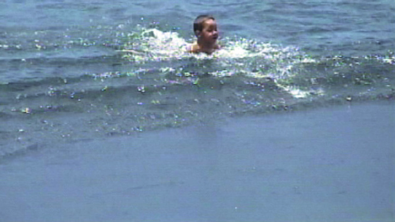 Watermannetje speelt op het strand, onbewust van een naderende haai.