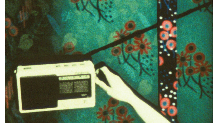 Een krachtige direct animation waarbij super8-filmmateriaal is bewerkt met inkt en wrijflettertjes en -symbolen.