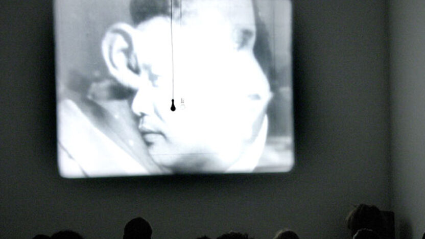 Structurele montage van politiek getint found footage-materiaal, onderbroken door een knipperende lamp. -