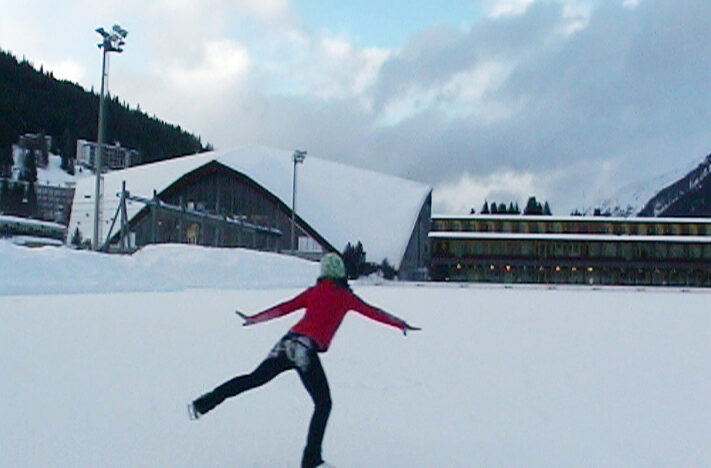 Hyper realistische beleving van ski-afdaling op topsnelheid. Satire op de sportreportage.