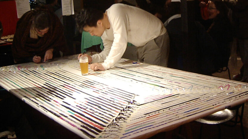Is Cucinema een conceptueel restaurant, een live performance, of eigenlijk een ouderwetse happening? Het Italiaanse kooklaboratorium Cucinema experimenteert met film en eten en onderzoekt de processen die celluloid en voedsel laten veranderen in cinema en gastronomie. Cucinema is drie jaar geleden nabij Rome opgericht en bestaat uit een variabel gezelschap van beeld- en geluidskunstenaars, waaronder Marco Ieie, Stefano De Angelis, Chris Blazen en Alex Mendizabal. Het publiek kan in het tijdelijk ingerichte culinaire filmlaboratorium ook zelf afwisselend pasta maken, groenten snijden en direct op film animeren. De filmstroken zijn overzichtelijk op tafels bevestigd en kunnen door iedereen op verschillende manieren worden bewerkt. Uiteindelijk wordt ‘s avonds de ontstane film geconsumeerd met live muziek van de Italianen zelf. En, zoals het de Italiaanse trots betaamd, alle ingrediënten zijn rechtstreeks uit hun thuisland meegenomen.