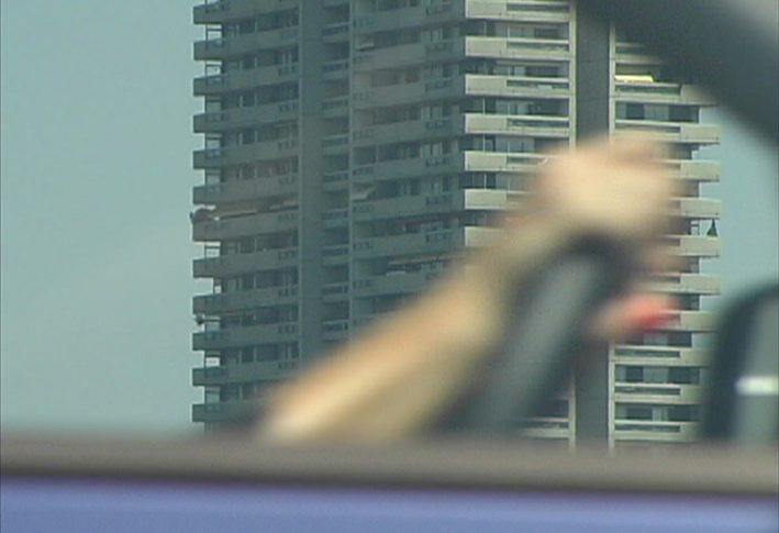 Wolkenkrabbers op de achtergrond, die naar de hemel reiken. Daarvoor, razend verkeer dat de grond niet raakt. Het zicht verbreedt zich en overschrijdt de grens tussen nabijheid en afstand, concreet en abstract.