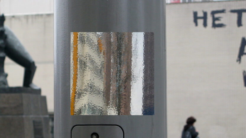 Een stickerproject vertaald in animatie. Als kleine, abstracte openbare schermpjes weerspiegelen glimmende vierkante stickers subtiel het stadsleven o -
