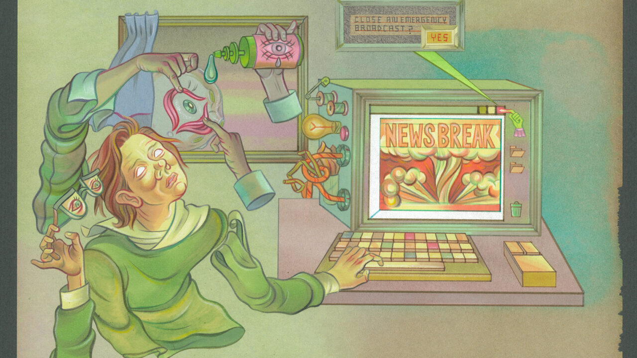 Daniel Barrow uit Winnipeg is vooral bekend van betoverende voorstellingen waarin hij zijn tekeningen – grotesk en gekunsteld, in een stijl die doet denken aan kinderboekenplaatjes – manipuleert met een overhead projector om tekenfilmachtige scènes te creëren die zijn verhaal illustreren. Zijn vertelling sleept ons mee in perverse, dromerige verhalen en vestigt daarbij de aandacht op zijn eigen pretenties en kunstgrepen. Barrow heeft inmiddels een eigen groep personages ontwikkeld, met als belangrijkste figuur een puber die vol is van de smarten, fantasieën en ontroerende ambivalentie van de puberteit, terwijl hij zijn weg zoekt tussen jeugd en volwassenheid. Every Time I See Your Picture I Cry volgt de zielenroerselen van een verbitterde en afgematte vuilnisman/gefnuikte kunstenaar die doelloos door de stad zwerft en vuilnis ophaalt in de vroege ochtend. ‘Het verhaal speelt zich af in een gemeenschap die voor de poorten van de hel staat, wat erg somber klinkt – en dat is het ook – maar ik ben nog altijd in de zaal om de somberheid en duisternis te verlichten.’ (DB)