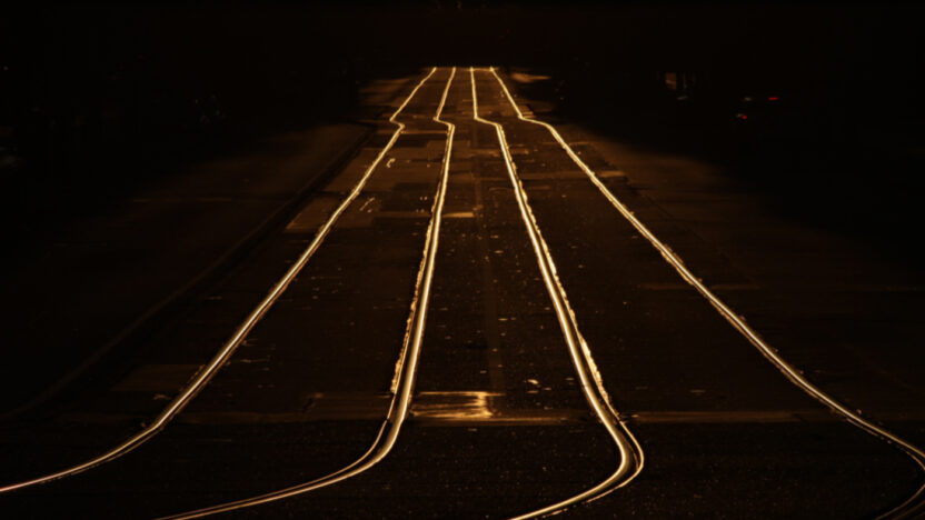 Als een vuurspugend monster trekt hij vonken in een droomachtig stadslandschap bij nacht. De maker weet dit werk met een minimum aan esthetische handelingen op subtiele wijze tot een geheel te smeden. Wij volgen zijn spoor.