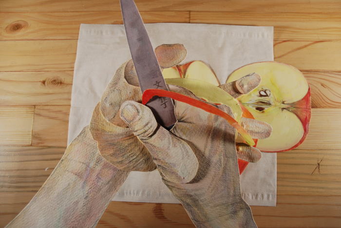 Animatie verbeeldt een klein huiselijk tafereel. Een appel wordt zorgvuldig geschild en verdeeld onder de tafelgenoten. En dan nog één, en nóg één. -