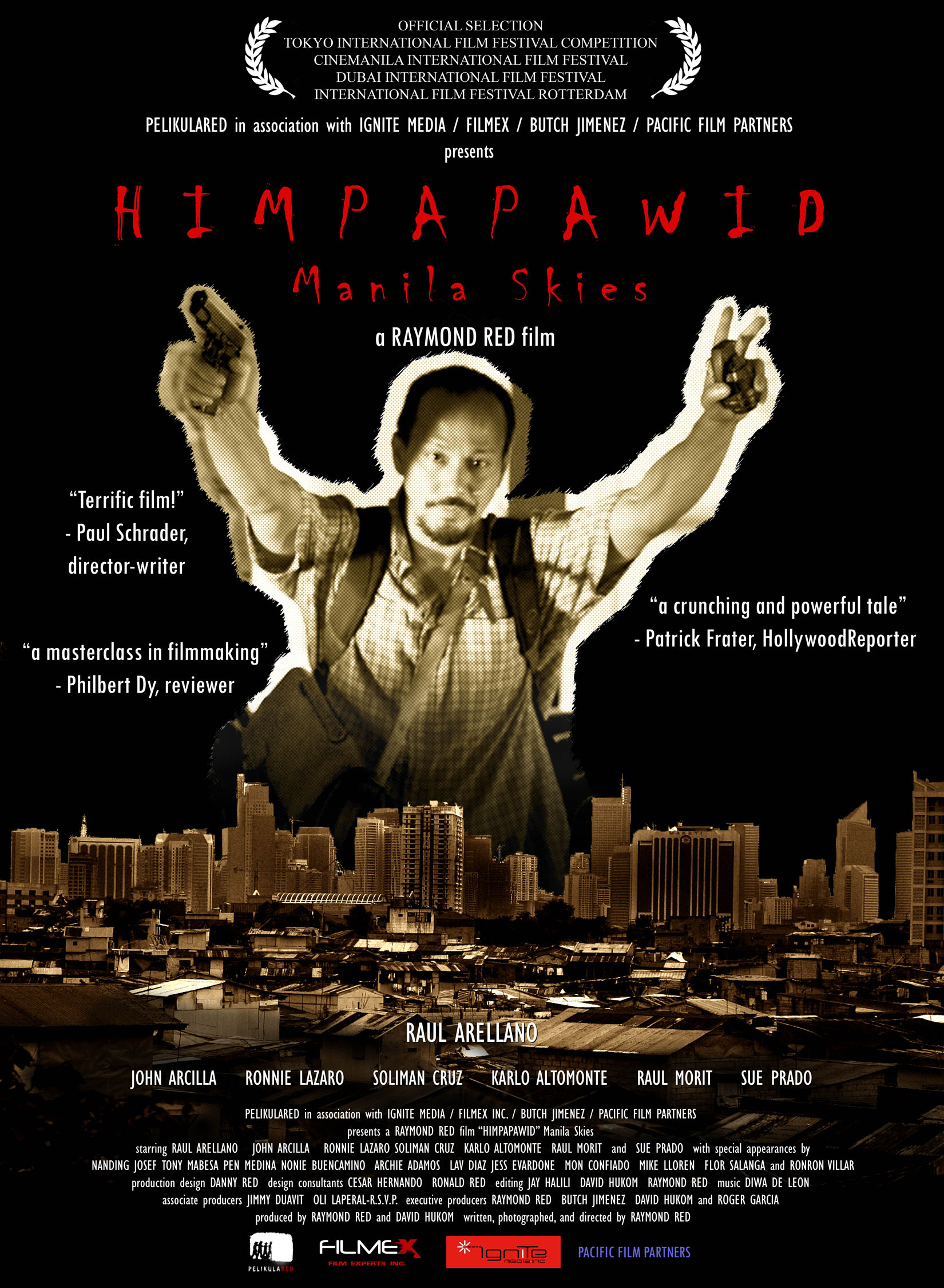 Net voor Raymond Red in Cannes als eerste Filippijn een Gouden Palm in ontvangst nam voor zijn korte film Anino (2000), las hij een nieuwsbericht over een Filippijn die een vliegtuig kaapte en er met een zelfgemaakte parachute uit sprong. In Manila Skies vraagt Red zich af wat iemand tot zo’n absurde daad brengt en tegelijk waarom zijn land maar niet vooruitkomt. Volgens een nieuwsitem in de film leeft 80 procent van de bevolking in armoede. Zo ook hoofdpersonage Raul, een plattelander die in Manila wanhopig en tevergeefs naar werk zoekt. Met zijn vrienden, allen lotgenoten, pleegt hij een overval maar raakt op het moment suprême in paniek en vlucht om uiteindelijk de vicieuze cirkel toch met geweld te doorbreken. Een realistisch portret met enkele magisch-realistische momenten, gefilmd met het zeer scherpe Red One-systeem, een reactie op de korrelige, hand-held stijl die nu in de Filippijnse onafhankelijke cinema en vogue is.