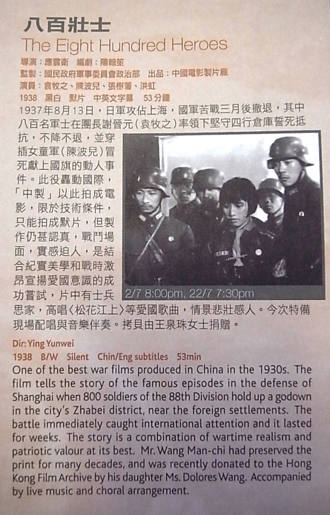 De verbeelding van een beroemde gebeurtenis tijdens de slag om Shanghai: 800 soldaten van het 88e Regiment tegen wat aanvoelt als het voltallige Japanse Keizerlijke Leger. Een soort Thermopylae, maar dan in China. Een schitterend, visueel verrassend juweeltje dat zelf ook een soort laatste stelling is: die van de zwijgende film op z’n Shanghais.