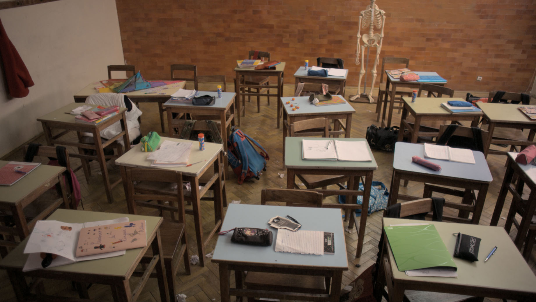 Kinderen vervelen zich tijdens de les op een basisschool. Ze trekken er samen op uit, de wilde natuur in die de school omringt. Daar ontmoeten ze vreemde dieren en spelen ze heerlijk met elkaar. Fijne plot- en tekstloze vertelling die de verbeelding laat spreken in zachte maar frisse kleuren.