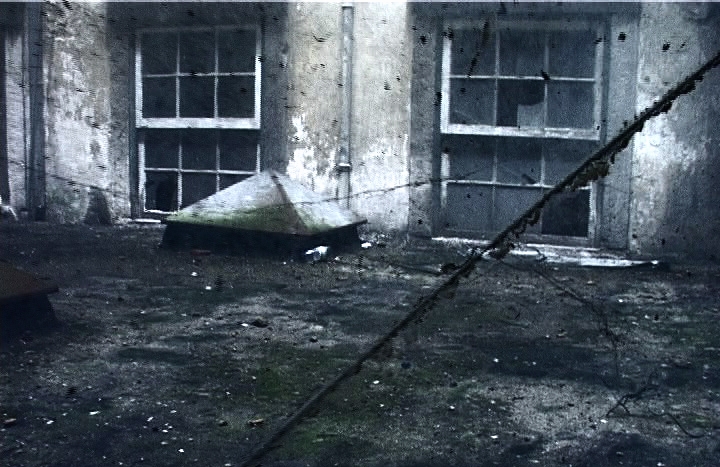 Alles dreigt uiteen te vallen en toch heeft deze verzwelgende mars in het verre verleden echt plaats gevonden. Er komt geen gekerm uit de aangrenzende kamer, de wind waait niet langer over de trap, de luchtdeeltjes werpen zich tegen elkaar, maar het is slechts leegte tegen leegte.