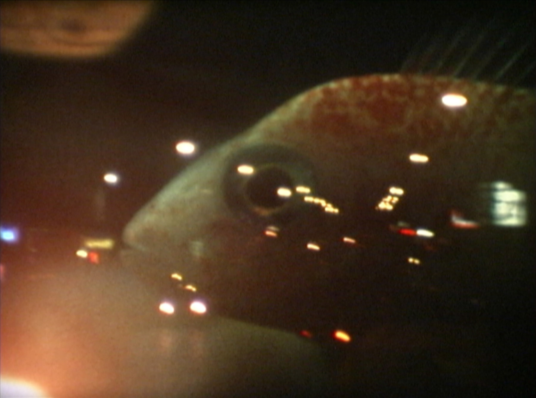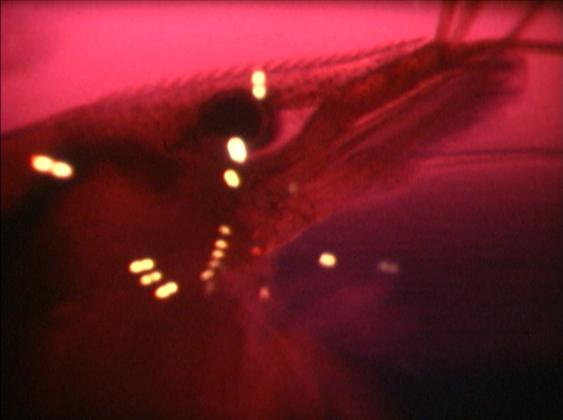 De onwerkelijke kleuren en patronen van Deep Red roepen herinneringen op aan voorbijzoevende bomen in de nacht, liggend op de achterbank van een auto. -