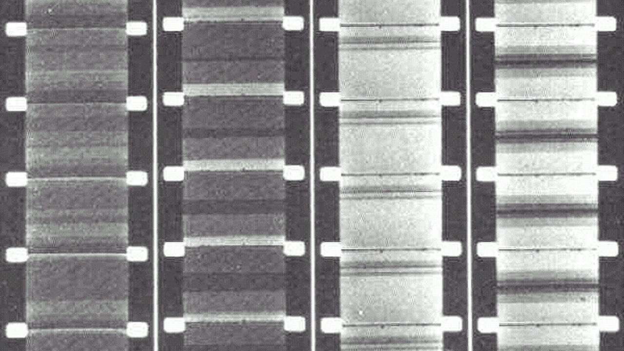 Ritmisch spel van licht en schaduw via gaatjes in de filmstrook wekt de suggestie dat het ponskaartgaatjes zijn die over het beeld dansen. Formeel ond -