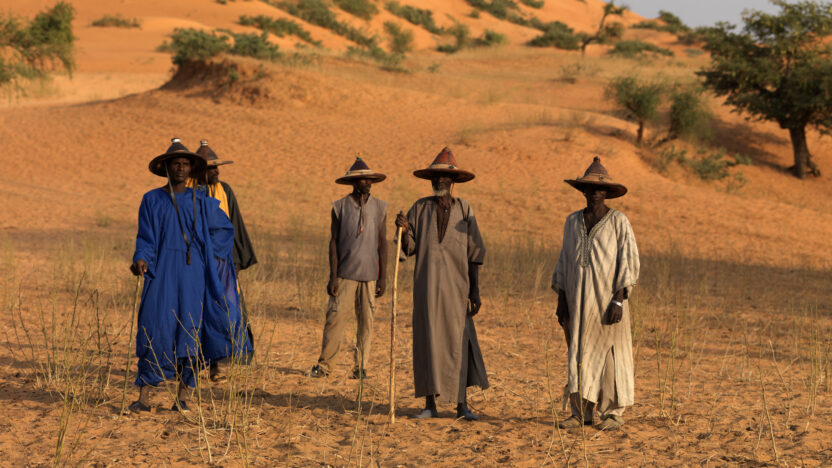 De Franse schrijver en kunstenaar François Augiéras (1925-1971) hield van avontuur, van grote gebaren en van mystificatie. Zo maakte hij een serie enorme fresco’s in een bunker in de Malinese woestijn, die hij vervolgens opzettelijk door de oprukkende zandduinen liet verzwelgen. Latere generaties moesten het grootse meesterwerk – de ‘Sixtijnse kapel van de woestijn’ – maar op zien te sporen. Miquel Barceló, een van de meest vooraanstaande hedendaagse Spaanse kunstenaars, is gefascineerd door het werk en het levensverhaal van Augiéras. Ook hij werkt vaak in Mali, waar hij inspiratie vindt voor zijn sculpturen en schilderijen. De Catalaanse regisseur Isaki Lacuesta maakte naast een documentaire over Barceló, El cuaderno de barro, in dezelfde periode ook de fictiefilm Los pasos dobles: een complexe, betoverende mix van fantasie en werkelijkheid in een veelheid aan verhaallijnen, geïnspireerd door Barceló (die zelf ook een rol speelt in de film), Augiéras, en de verteltraditie van het Malinese Dogon-volk. Amateur-acteurs vertolken de meeste rollen in deze winnaar van de Gouden Schelp in San Sebastián.