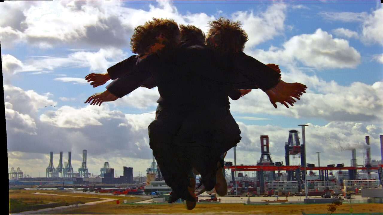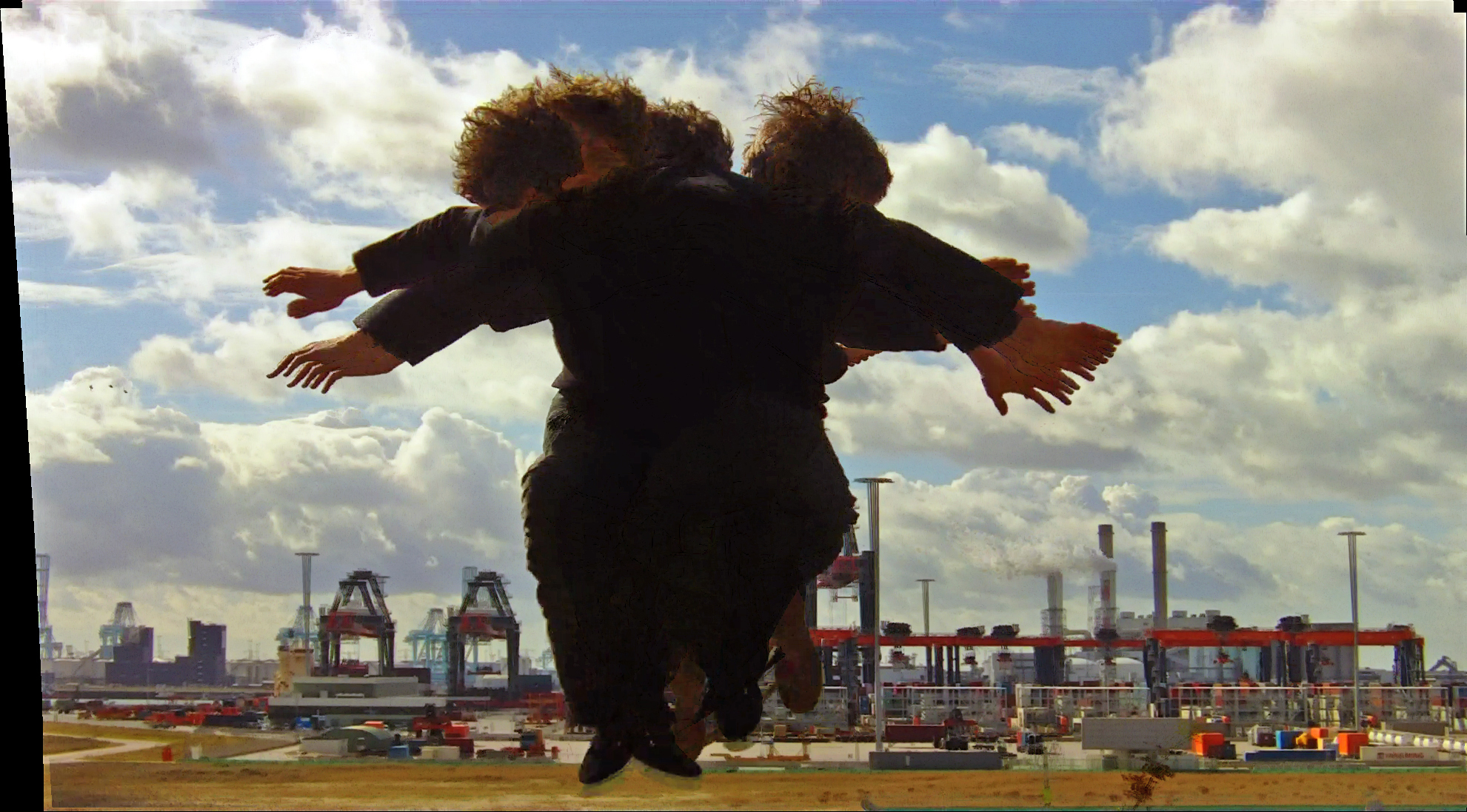 Uitzicht vanaf de Rotterdamse Edisonbaai op Yangtzehaven, waar grote containers uit China gelost worden. Een samenvoeging van twee min of meer verschillende werkelijkheden: een zwevende mens-figuur en een industriële horizon. Met een soundtrack van natuurlijke en elektronische geluiden, opgenomen on the spot.
