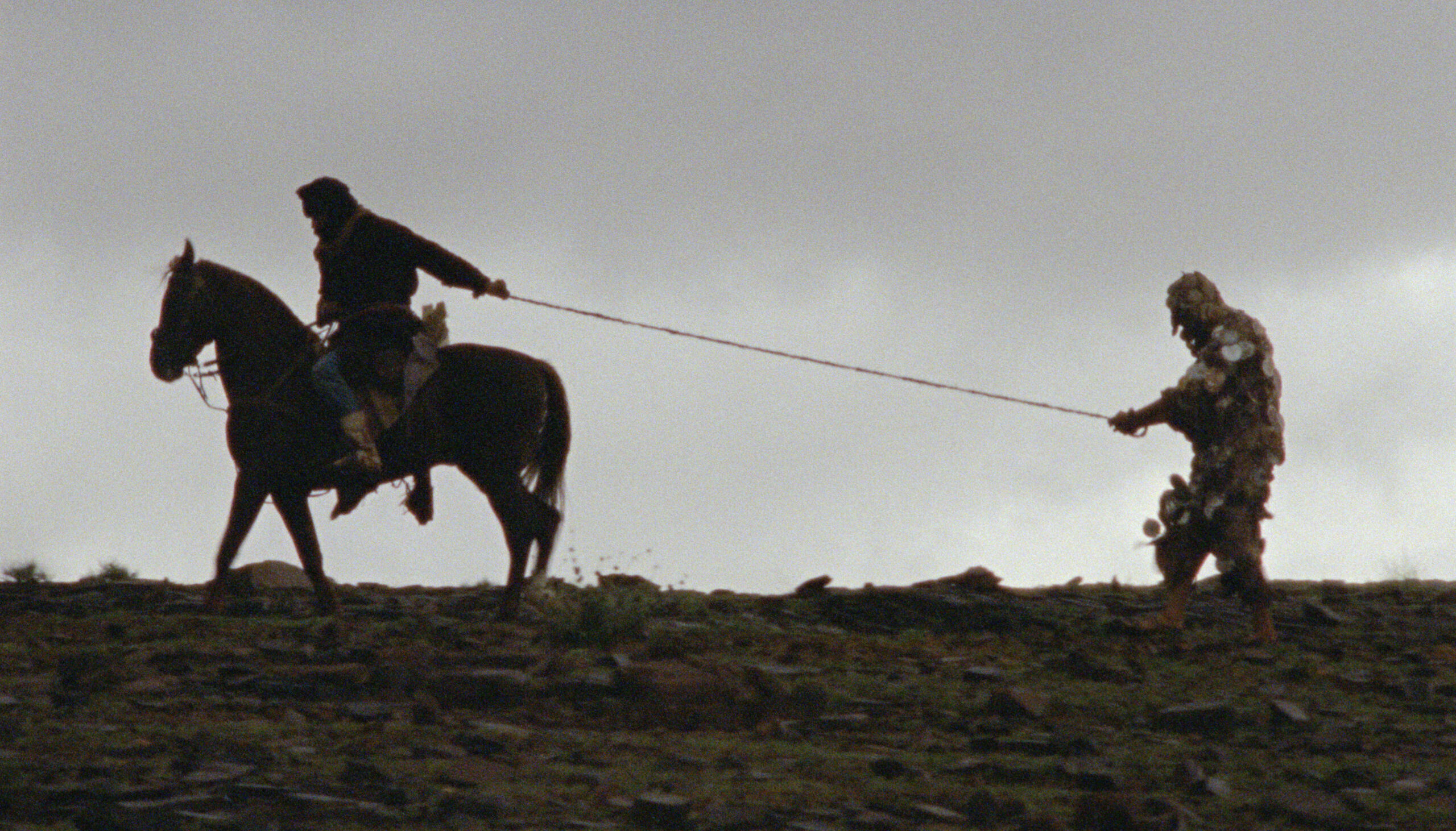 “Kunnen alle mensen die niet acteren weg?” De ontberingen van het regisseursvak zijn voelbaar in de nieuwe Ben Rivers-film, die even mysterieus is als de titel (een verwijzing naar de literatuur van Paul Bowles). Rivers was in het Atlasgebergte van Marokko aanwezig op de sets van collega Oliver Laxes Herzogiaanse productie Las Mimosasen documenteerde daar vooral frustratie, leemte en inertie. Het is pas als Laxe het filmen niet meer ziet zitten (let op: langzaamaan begeven we ons op fictioneel gebied) dat The Sky Trembles… meer wordt dan een film in een film en een film over film. Rivers laat Laxe dan een nieuwe lijdensweg ondergaan, gebaseerd op Bowles’ korte verhaal A Distant Episode. De Spaanse regisseur wordt ontvoerd door een groep nomaden die hem als een glimmend, dansend object aan een andere stam verkopen. Het is een ondenkbare handeling die evenzeer reflecteert op de moeizame relatie tussen mens, natuur en film als op de moeizame achter-de-schermen-scènes van daarvoor.