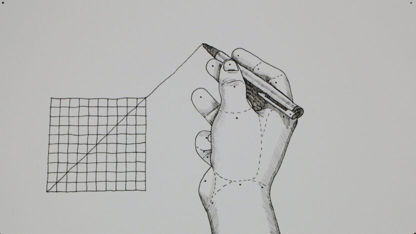 In deze handgetekende animatie wordt een lijn doorgetrokken op een raster. Als de lijn het raster verlaat, verspreidt het proces zich en heeft zijn we -