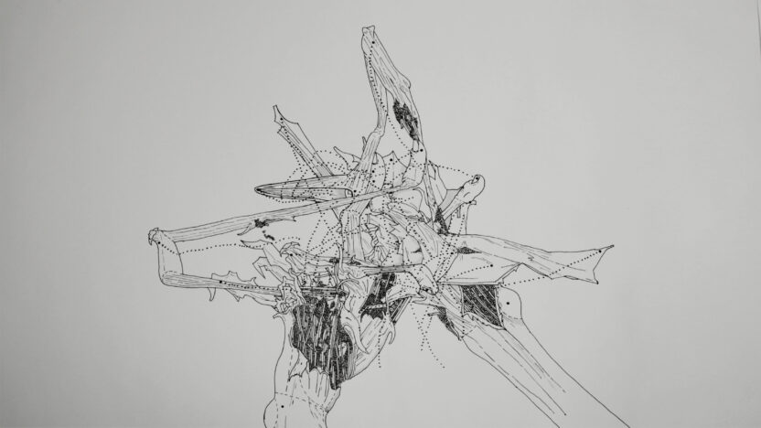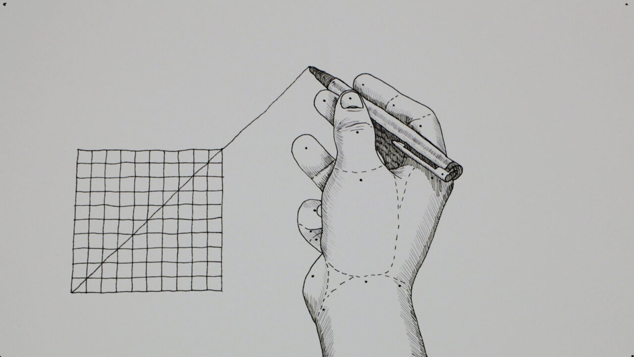 In deze met de hand getekende animatie wordt een lijn doorgetrokken op een raster. Als de lijn het raster verlaat, verspreidt het proces zich naar de omgeving en wordt het weerspiegeld. Voorbij elke grens veroorzaakt de extrapolatie van beweging vervorming op een systematische, maar speculatieve manier.